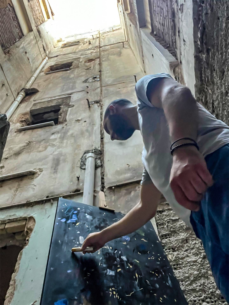 «Παρατήρησα το ενδιαφέρον που είχαν. Ευτυχώς, δεν είχε αλλαχθεί καμία τους στην πάροδο του χρόνου. Ήταν και οι 8 αυτούσιες πόρτες από τα διαμερίσματα της πολυκατοικίας του Μεσοπολέμου. Έτσι, ξεκίνησε η ιδέα να τις διασώσω -την επόμενη ημέρα ήρθε το φορτηγό και τα πήρε όλα για να τα πετάξει-, αλλά και η σκέψη για μια παρουσίασή τους. Κατά καιρούς συλλέγω πράγματα, κυρίως αντικείμενα από παλιά κτήρια. Η συγκεκριμένη ενότητα, ωστόσο, συνδυάστηκε με τη ζωγραφική δουλειά που έκανα εκείνη την περίοδο και η οποία βασίζεται στη χειρονομία και στον εξπρεσιονισμό. Όταν λοιπόν ήρθαν οι πόρτες στην κατοχή μου, η ιδέα ολοκληρώθηκε».