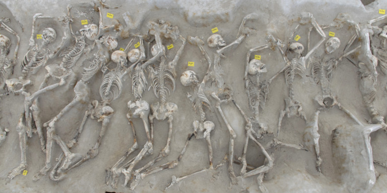 «Η μαζική ταφή αποτελείται από 79 σκελετούς σε τρεις σειρές. Για την προστασία τους χρησιμοποιήθηκε μία τέντα η οποία θα είχε διάρκεια ενός χρόνου, αλλά παραμένει να καλύπτει το σκάμμα ως σήμερα. Πρέπει το ΚΑΣ να γνωμοδοτήσει για την τύχη του ευρήματος με τα σημερινά δεδομένα. Όλοι μιλάμε για την εξαιρετική προστασία που εξασφαλίζουμε αλλά αφήνουμε μνημεία στο έλεος τους. Η απόφαση που ελήφθη το 2016 προέκρινε τη διατήρηση κατά χώρα, με ενέργειες που θα διασφάλιζαν το εύρημα. Οι ενέργειες αυτές δεν έγιναν ποτέ. Σήμερα το εύρημα είναι σε πολύ κακή κατάσταση. Ένα μεγάλο μέρος του μοναδικού ευρήματος έχει ήδη χαθεί».
