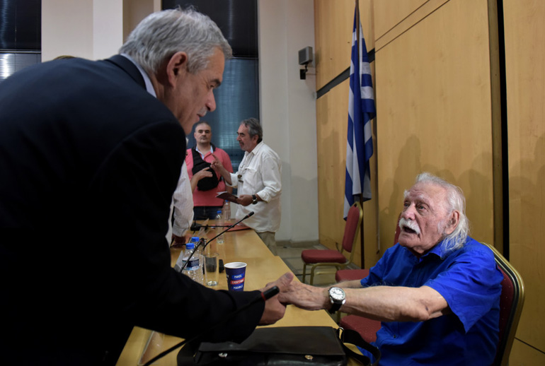 Ήταν πολύς κόσμος μαζεμένος. Ο Μανώλης Γλέζος παρουσίαζε το βιβλίο του «Ακρωνύμια» . Κάποια στιγμή, η ιστορία βλέπετε είναι βαριά και καμιά φορά ασήκωτη, λύγισε. «Κι αν πεθάνω θα σας κυνηγάει η ύπαρξή μου» είπε και έσκυψε πιάνοντας το κεφάλι του. Ένα χέρι τον κτύπησε ελαφρά στον ώμο, κάτι σαν συντροφικό χάδι.