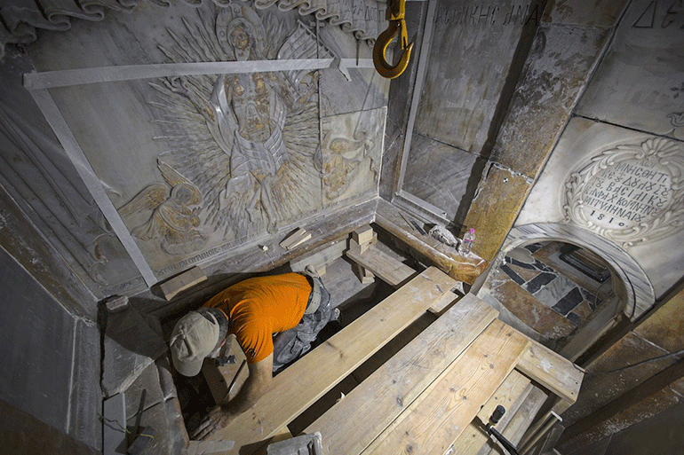 Ιδιαίτερα σημαντική ήταν η τεκμηρίωση και η μελέτη του Παναγίου Τάφου από τη διεπιστημονική ομάδα του ΕΜΠ, όταν μετά από επτά αιώνες μετακυλήθηκε η ταφική πλάκα του Αρκοσολίου και αποκαλύφθηκε το εσωτερικό του Παναγίου Τάφου στο πλαίσιο εργασιών ενεμάτωσης των εσωτερικών φάσεων του Ιερού Κουβουκλίου, οπότε και επετεύχθη η στερέωση του Ιερού Βράχου και η ανάδειξή του μέσα από το παράθυρο που άνοιξε στην ορθομαρμάρωση του ταφικού θαλάμου.