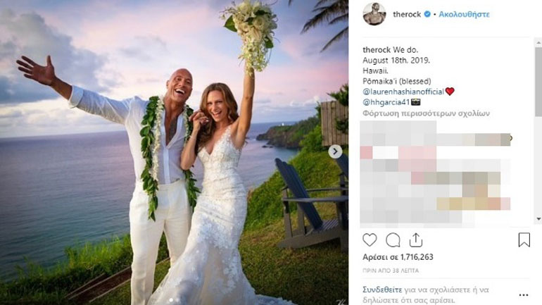 Ο Ντουέιν «The Rock» Τζόνσον παντρεύτηκε την εδώ και πολλά χρόνια σύντροφό του Λόρεν Χάσγιαν. Η είδηση έγινε γνωστή από την ανάρτηση που έκανε ο ηθοποιός στον λογαριασμό του στο Instagram. Ο Τζόνσον ανέβασε δύο φωτογραφίες γράφοντας στη λεζάντα: «Το κάναμε. 18 Αυγούστου 2019. Χαβάη. Ευλογημένος».