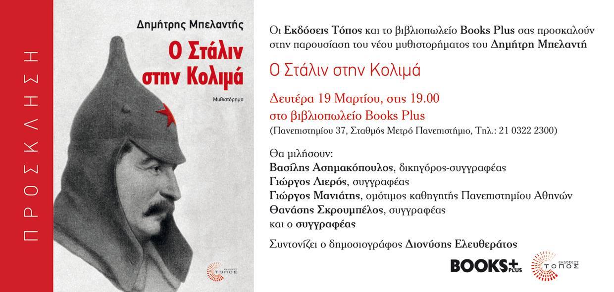 Εκδήλωση -παρουσίαση του μυθιστορήματος του συγγραφέα Δημήτρη Μπελαντή «Ο Στάλιν στην Κολιμά» (εκδόσεις Τόπος, 2017) το Σάββατο 28 Απριλίου και ώρα 19.00 στο βιβλιοπωλείο Επίκεντρον ( Άγιοι Ανάργυροι Αττικής, πλατεία Αγίων Αναργύρων αρ. 5) .