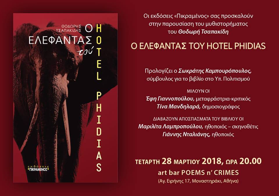 Το μυθιστόρημα του Θοδωρή Τσαπακίδη «Ο ελέφαντας του Hotel Phidias» παρουσιάζουν οι εκδόσεις «Πικραμένος» στο art bar POEMS n’ CRIMES...