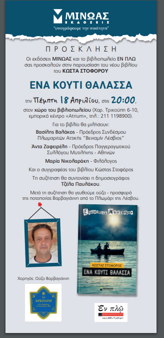 Tο Βιβλιοπωλείο Εν Πλω (Χαριλάου Τρικούπη 6, Αθήνα) και οι εκδόσεις Μίνωας σας καλούν την Πέμπτη 18 Απριλίου στις 8 το βράδυ στην παρουσίαση του νέου βιβλίου του Κώστα Στοφόρου «Ένα κουτί θάλασσα» το οποίο διαδραματίζεται στη Λέσβο.