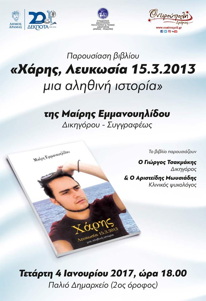 Ο Δήμος Δράμας, η Δ.Ε.Κ.ΠΟ.Τ.Α. του Δήμου και ο Σύνδεσμος Αθλητισμού, Πολιτισμού και Τέχνης Δικηγόρων Δράμας – Ροδόπης σας προσκαλούν στην παρουσίαση του βιβλίου της Δικηγόρου- Συγγραφέως, Μαίρης Εμμανουηλίδου με τίτλο: «Χάρης, Λευκωσία 15.3.2013. Μια αληθινή ιστορία».