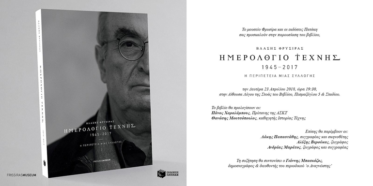 Το μουσείο Φρυσίρα και οι εκδόσεις «Πατάκη» παρουσιάζουν το βιβλίο του Βλάση Φρυσίρα «Ημερολόγιο Τέχνης 1945 – 2017 Η περιπέτεια μιας συλλογής» τη Δευτέρα 23 Απριλίου 2018 στις 19.30, στην Αίθουσα Λόγου της Στοάς του Βιβλίου Πεσμαζόγλου 5 και Σταδίου.