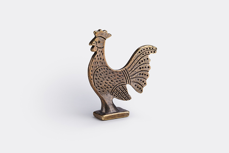 Μπρούτζινος πετεινός εμπνευσμένος από τον χάλκινο πετεινό, αφιέρωμα στο Ιερό της Ακρόπολης στο τέλος του 6ου αιώνα π.Χ. Το έκθεμα βρίσκεται στον 1ο όροφο του Μουσείου Ακρόπολης, Αίθουσα Αρχαϊκής Ακρόπολης (προθήκη 20 αριθμός 17).