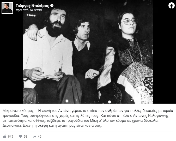Ο Γιώργος Νταλάρας αποχαιρέτισε τον Αντώνη Καλογιάννη με ένα συγκινητικό μήνυμα στην προσωπική του σελίδα στο Facebook.