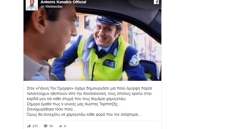 Το δικό του μήνυμα για τον χαμό του Κώστας Ταρπατζή έστειλε και ο Αντώνης Κανάκης από τον λογαριασμό του στο Facebook.