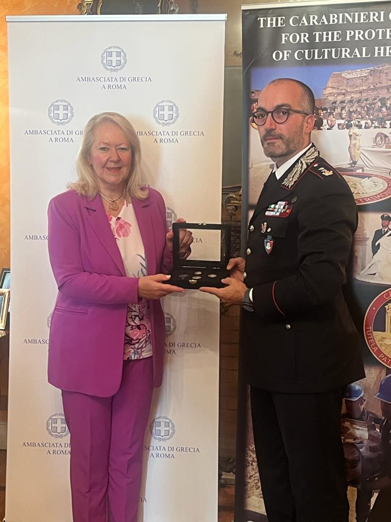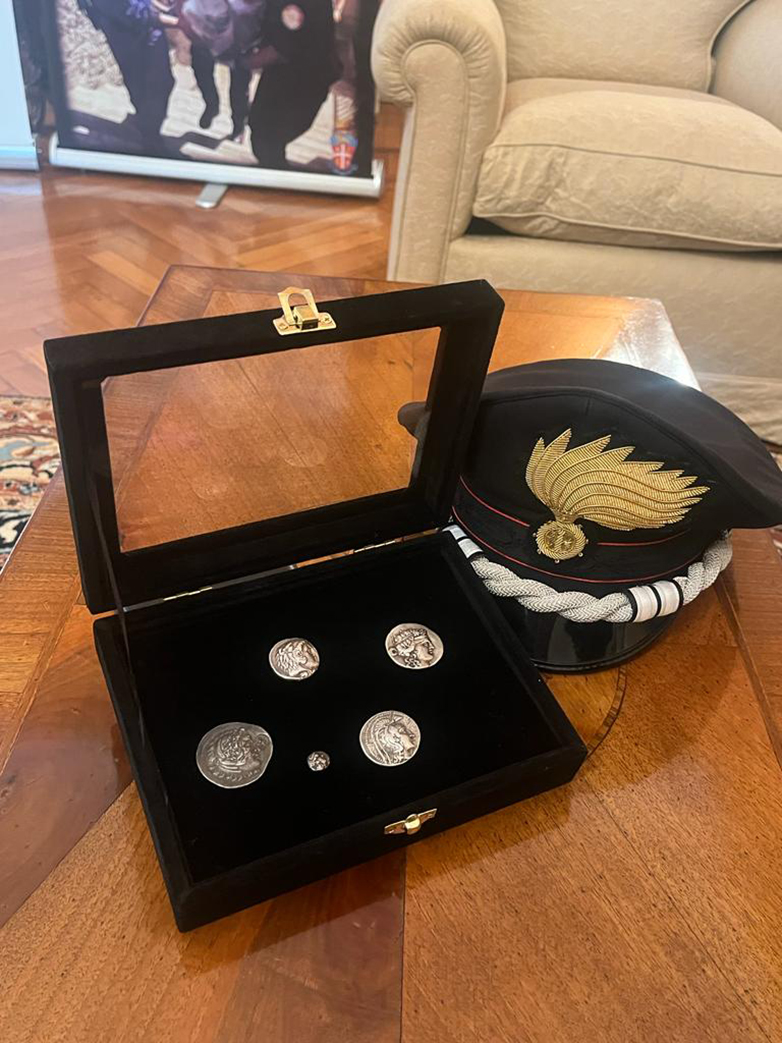 Το Σώμα των καραμπινιέρων, ειδικευμένο στην καταπολέμηση του παράνομου εμπορίου έργων τέχνης και αρχαιολογικής κληρονομιάς, κατέσχεσε και επέστρεψε στην Ελλάδα, μέσω της πρέσβεως στην Ιταλία, Ελένης Σουρανή, πέντε αρχαιοελληνικά νομίσματα, τα οποία είχαν τεθεί προς πώληση στο διαδίκτυο έναντι 1.500 ευρώ. Σύμφωνα με πληροφορίες, ο ιδιώτης που κατείχε παράνομα τα νομίσματα δεν είχε αντιληφθεί την πραγματική αξία τους.