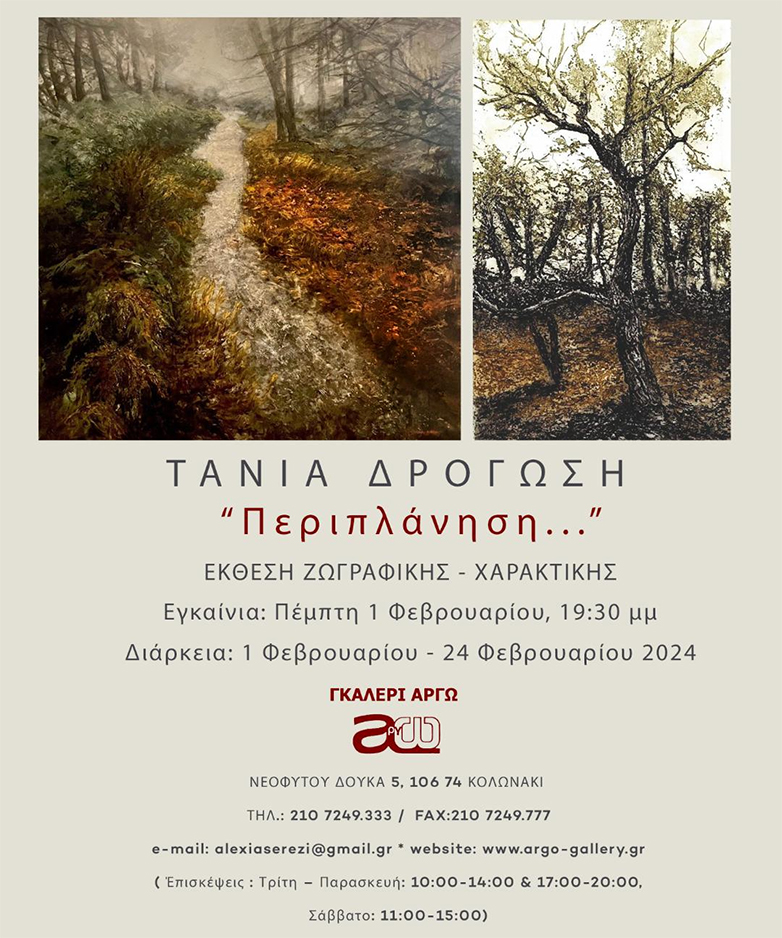 Σε μια συναρπαστική εικαστική αφήγηση με οδηγό τη φύση και το φυσικό τοπίο, μια γοητευτική περιήγηση στις διαφορετικές φάσεις και τις δημιουργικές εναλλαγές της, μας καλεί η Τάνια Δρογώση, με τη νέα της ατομική έκθεση με τίτλο «Περιπλάνηση…», που εγκαινιάζεται στην γκαλερί Αργώ την Πέμπτη 1η Φεβρουαρίου 2024.