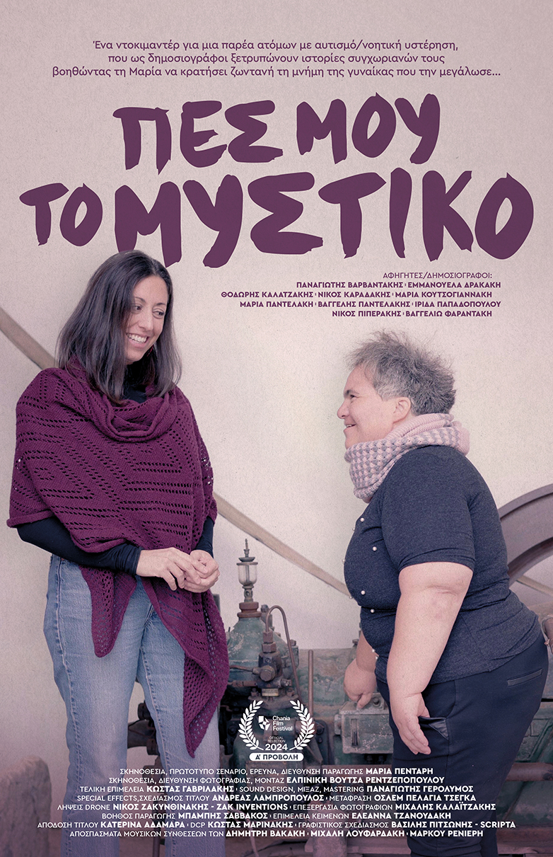 Το ντοκιμαντέρ «Πες μου το μυστικό» δεν είναι ένα ντοκιμαντέρ για τα άτομα με αυτισμό – νοητική υστέρηση, αλλά ένα ντοκιμαντέρ για τους ανθρώπους αυτού του τόπου που κρατούν ζωντανή την παράδοση μας και μας αποκαλύπτουν τα μυστικά της και έγινε με συνεργάτες άτομα με αυτισμό/νοητική υστέρηση, επιμένουν η Μαρία με την Ελπινίκη που μαζί με την παρέα τους πέρασαν, έμεινα, κουβέντιασαν έζησαν στιγμές και εικόνες σε χωριά όπως Θέρισο, Μεσκλά, Φουρνές, Παλαιά Ρούματα…