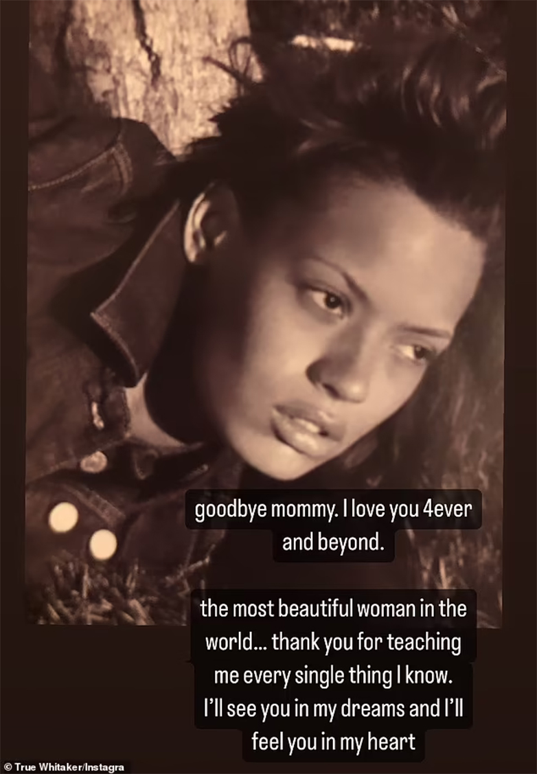 Η μικρότερη κόρη του πρώην ζευγαριού, True Whitaker, 25 ετών, επιβεβαίωσε την τραγική είδηση στον λογαριασμό της στο Instagram την Πέμπτη, αποκαλώντας την «η πιο όμορφη γυναίκα στον κόσμο» σε μια σπαρακτική ανάρτηση, αλλά δε διευκρίνισε την αιτία θανάτου.