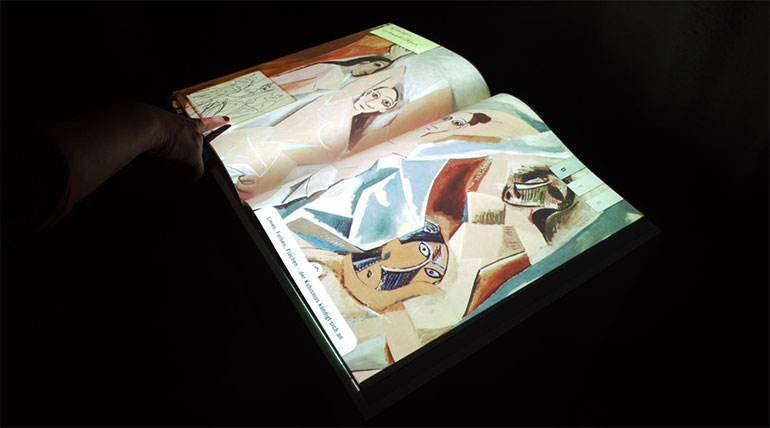 Δύο διαδραστικά βιβλία συνδυάζουν την απτική εμπειρία των τυπωμένων, εικονογραφημένων βιβλίων με τις απεριόριστες δυνατότητες των ψηφιακών μέσων. Κάποια κομμάτια των βιβλίων είναι τυπωμένα, ενώ άλλα έχουν κινούμενες εικόνες που προβάλλονται όταν ο επισκέπτης ακουμπήσει ένα συγκεκριμένο σημείο του βιβλίου. Για παράδειγμα, φωτογραφίες από γκαλερί, στούντιο ή εστιατόρια εμφανίζονται διαδραστικά όταν ακουμπήσει κανείς σημεία του χάρτη του Παρισιού. Με την αφή αλλάζουν, επίσης, τα χρώματα ενός πίνακα ή εμφανίζονται τα προσχέδια του καλλιτέχνη για ένα έργο του. Σύντομα ηχητικά στοιχεία συμπληρώνουν τις κινούμενες εικόνες και ολοκληρώνουν την εμπειρία. Το περιεχόμενο των βιβλίων επικεντρώνεται στη στιλιστική ανάπτυξη του Πικάσο την επταετία 1900-1907, κατά την οποία άνοιξε τον δρόμο για την εμφάνιση του κυβισμού.