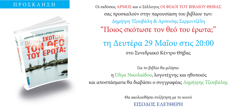 Οι εκδόσεις «Αρμός» και ο σύλλογος «Οι Φίλοι του Βιβλίου Θήβας» σας προσκαλούν στην παρουσίαση του βιβλίου των Δημήτρη Τζουβάλη και Αρσινόης Σερμιντζέλη «Ποιος σκότωσε τον θεό του έρωτα;» τη Δευτέρα 29 Μαΐου στις 20.00 στο Συνεδριακό Κέντρο Θήβας.