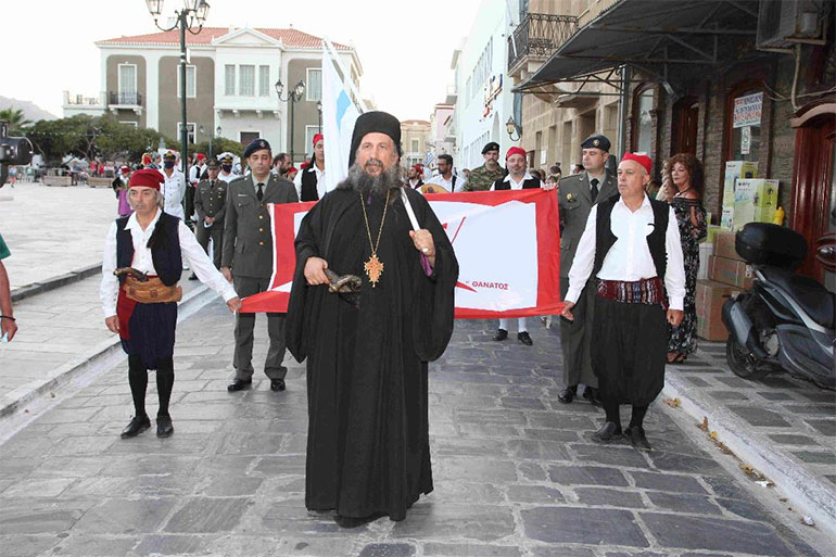 Πολύ συγκινητική ήταν και η αναπαράσταση της ανύψωσης των λαβάρων της Επανάστασης στην εκκλησία του Αγίου Γεωργίου στη Χώρα της Άνδρου, από τον πατέρα Αέτιο, στην Εκκλησία του Αγίου Γεωργίου, στη Χώρα της Άνδρου, όπως είχε γίνει στις 10 Μαΐου 1821 από τον Θεόφιλο Καϊρη και τον Άγιο Άνδρου Διονύσιο Καρκάκη. Με την προτροπή του ιερομόναχου Αέτιου ψάλθηκε από όλους το “Τη Υπερμάχω” και όλος ο κόσμος που παραβρέθηκε έψαλλε δυνατά και με συγκίνηση τον εθνικό μας ύμνο και αμέσως μετά  το κοινό βροντοφώναξε «Ελευθερία ή Θάνατος», «Ζήτω η Άνδρος», «Ζήτω η Ελλάς» και το αίσθημα της εθνικής υπερηφάνειας κορυφώθηκε με το χαρμόσυνο χτύπημα της καμπάνας όπως τότε.