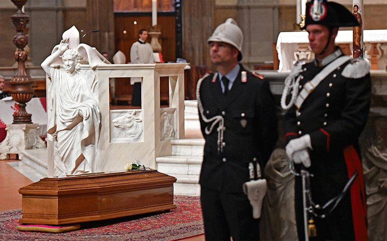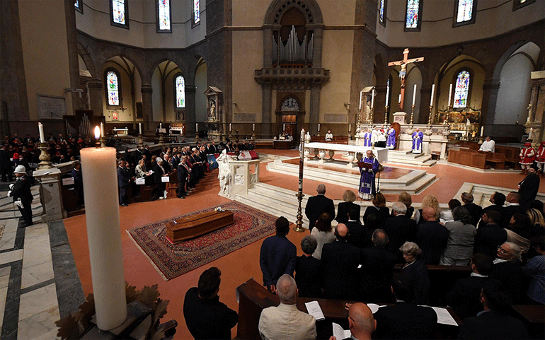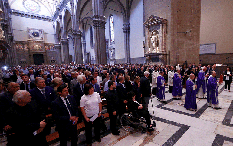 Σχεδόν 1.500 άνθρωποι πήραν θέση στο εσωτερικό του Ντουόμο, του εμβληματικού καθεδρικού ναού της Φλωρεντίας αλλά πολλοί περισσότεροι συγκεντρώθηκαν περιμετρικά του φημισμένου μνημείου της πρωτεύουσας της Τοσκάνης για το τελευταίο αντίο στον «μαέστρο» που ήταν στενά συνδεδεμένος με την πόλη αυτή.