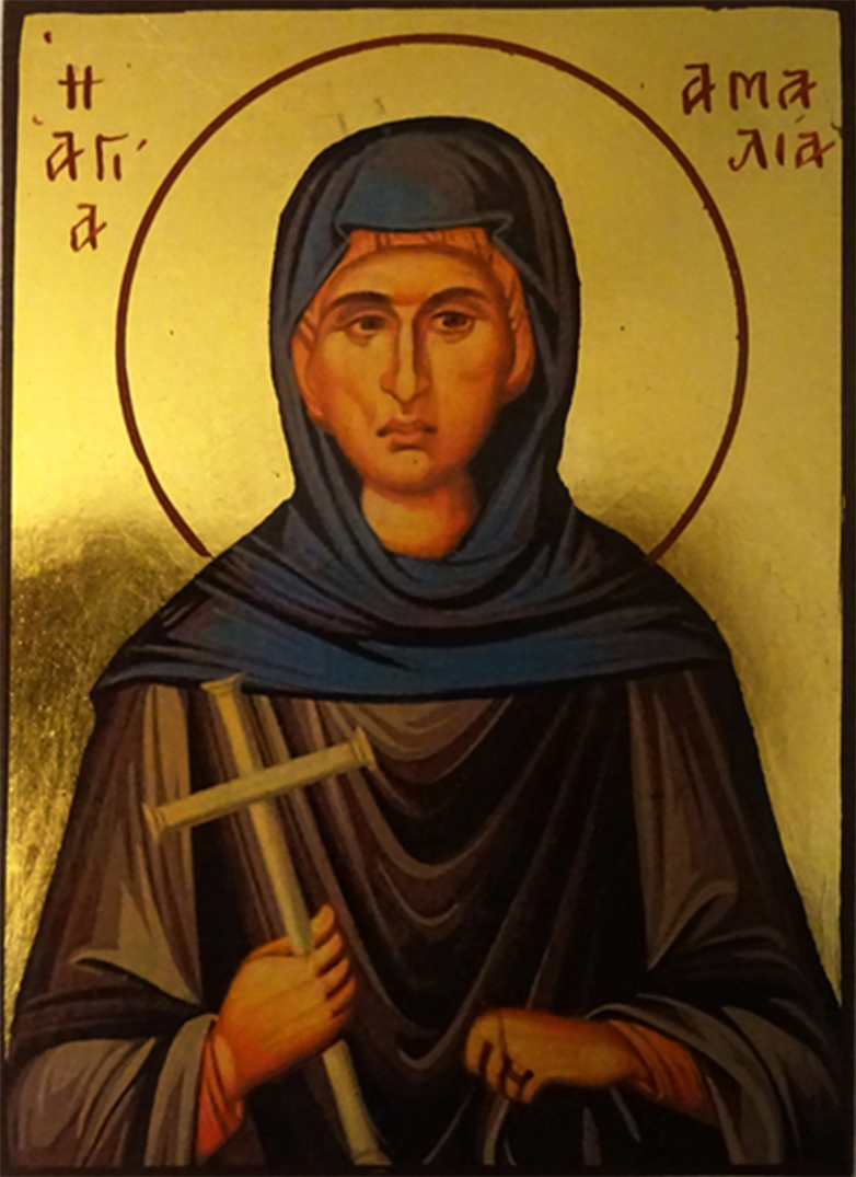 Αμαλίαν οσίαν δεύτε τιμήσωμεν ότι δόξα ανθρώπων καταφρονήσαντα και τον νυμφίον της Χριστό ακολουθήσασα μοναζουσών καλλονή ανεδείχθης ηρωΐς ασκήσεως και αγώνων, διό μη παύσεις πρευβεύων ελεηθήναι τας ψυχάς ημών.