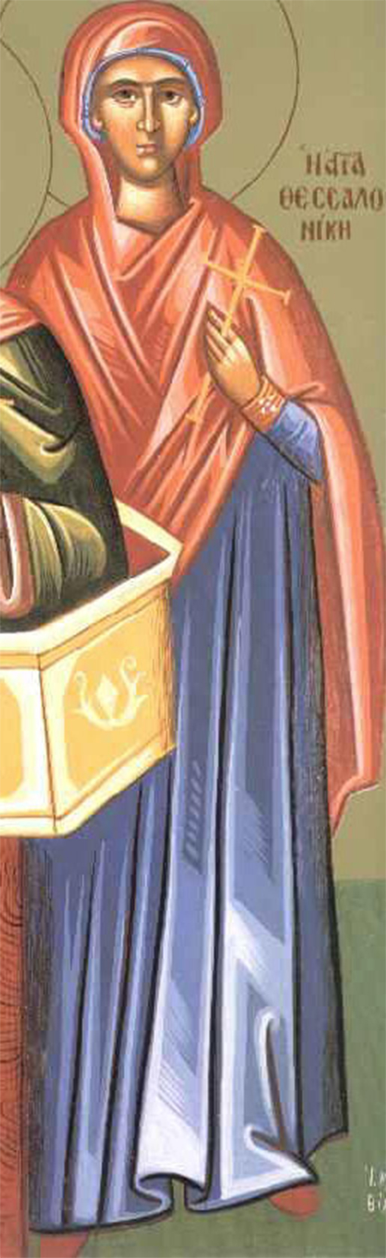 Η Θεσσαλονίκη, σύμφωνα με τους συναξαριστές, ήταν κόρη του Κλέωνα, ενός πλούσιου εθνικού της Αμφίπολης, ο οποίος παράλληλα ήταν και ιερέας στον ειδωλολατρικό ναό της περιοχής. Η πίστη της στον Χριστό και η άρνησή της να αλλαξοπιστήσει προκάλεσε την απάνθρωπη αντίδραση του πατέρα της, ο οποίος διέταξε τέσσερις άνδρες να τη γυμνώσουν και να τη μαστιγώσουν. Βαρύτατα τραυματισμένη, η Θεσσαλονίκη εξορίστηκε από τον τοπικό ηγεμόνα Θορύβιο και παρέδωσε το πνεύμα της δοξάζοντας τον Κύριο.