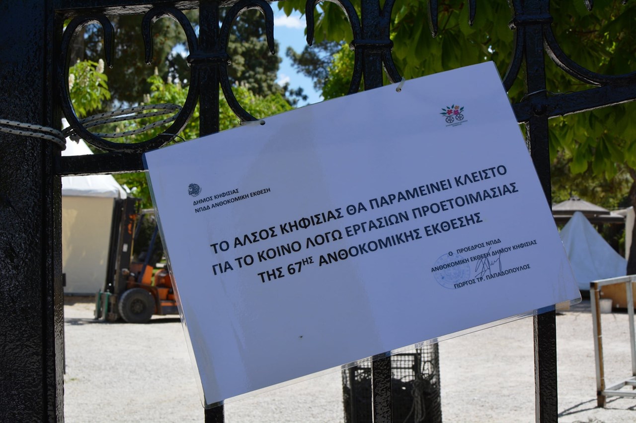 Οι πύλες του Άλσους Κηφισιάς έκλεισαν για τους επισκέπτες του καθώς έχουν αρχίσει να τοποθετούνται τα καινούρια περίπτερα των ανθοπαραγωγών.