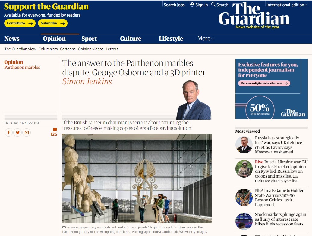 Με την υπόθεση της επιστροφής των Γλυπτών του Παρθενώνα από το Βρετανικό Μουσείο στο Μουσείο της Ακρόπολης καταπιάνεται ο αρθρογράφος Σάιμον Τζένκινς σε σχετικό δημοσίευμα της ηλεκτρονικής έκδοσης του Guardian.