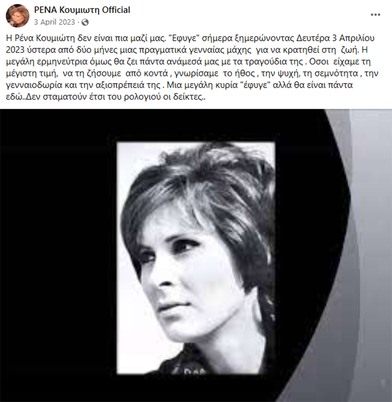 «Η Ρένα Κουμιώτη δεν είναι πια μαζί μας. “Έφυγε” σήμερα ξημερώνοντας Δευτέρα 3 Απριλίου 2023 ύστερα από δύο μήνες προσωπικής μάχης με τη ζωή. Η μεγάλη ερμηνεύτρια όμως θα ζει πάντα ανάμεσά μας με τα τραγούδια της . Όσοι είχαμε τη μέγιστη τιμή, να τη ζήσουμε από κοντά , γνωρίσαμε το ήθος , την ψυχή, τη σεμνότητα και την αξιοπρέπειά της . Μια μεγάλη κυρία “έφυγε” αλλά θα είναι πάντα εδώ… Δεν σταματούν έτσι του ρολογιού οι δείκτες…» ανέφερε η ανάρτηση.