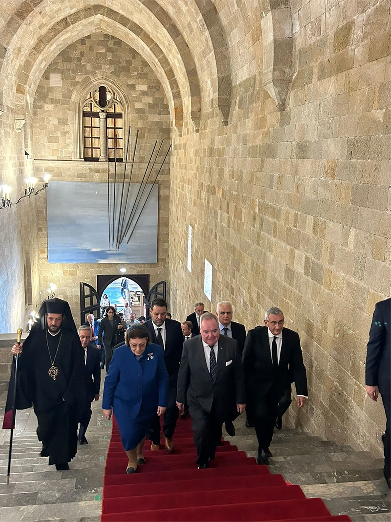 Η Λίνα Μενδώνη, στον χαιρετισμό της, σημείωσε ότι «η ημέρα είναι ιστορική, καθώς σηματοδοτεί την πρώτη επίσημη επίσκεψη Μεγάλου Μαγίστρου του Κυρίαρχου Στρατιωτικού Νοσοκομειακού Τάγματος του Αγίου Ιωάννου της Ιερουσαλήμ, της Ρόδου και της Μάλτας στην Ελλάδα, μετά την έναρξη διπλωματικών σχέσεων ανάμεσα στη χώρα μας και το Τάγμα, το 2021. Είναι η πρώτη φορά, μετά από 500 χρόνια, που Μέγας Μάγιστρος επισκέπτεται το νησί της Ρόδου, όπου το Τάγμα διαδραμάτισε κεντρικό ρόλο για 217 χρόνια».