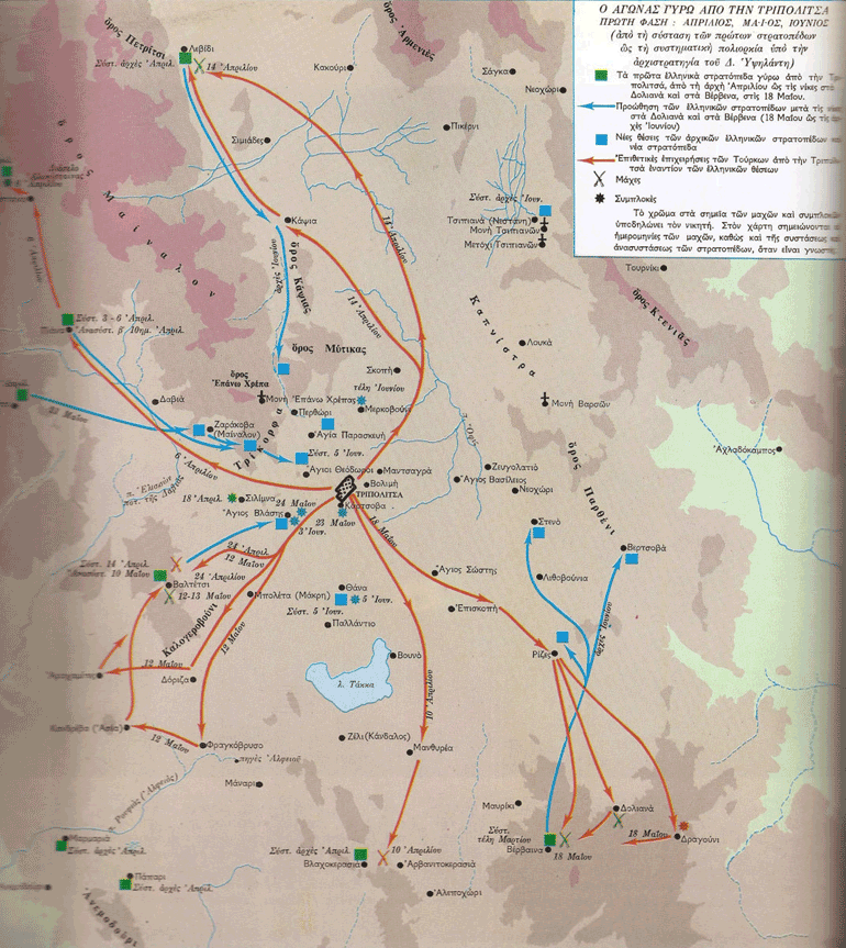 Οι Έλληνες επαναστάτες υπό τον Νικηταρά νικούν τους Οθωμανούς Τούρκους στα Δολιανά της Αρκαδίας στις 18 Μαΐου 1821 και επισφραγίζουν τη μεγάλη νίκη στο Βαλτέτσι (12-13 Μαΐου). Ο κλοιός γύρω από την Τριπολιτσά σφίγγει, σύμφωνα με το στρατηγικό σχέδιο του Θεόδωρου Κολοκοτρώνη.