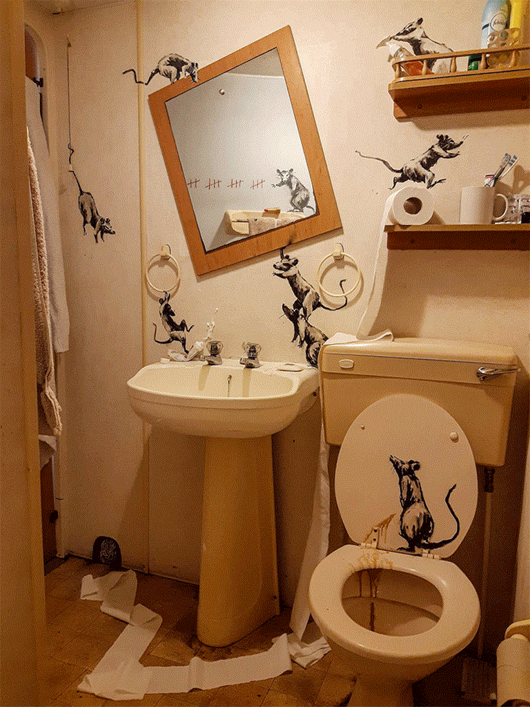 Πριν λίγο, ανήρτησε στον λογαριασμό του στο Instagram φωτογραφίες του καινούργιου δημιουργήματός του: μια αγέλη σκανταλιάρηδων αρουραίων – είναι, άλλωστε και το καλλιτεχνικό σήμα κατατεθέν του – κάνει το μπάνιο μαντάρα. Κάνουν κούνια στους μεταλλικούς κρίκους όπου κρεμάμε τις πετσέτες, τρέχουν πάνω σε ρολά χαρτιού υγείας, κρατάνε σημειώσεις για τις μέρες που περνούν με μαρκαδόρο στους τοίχους και κάνουν τη λεκάνη της τουαλέτας μια σιχαμερή αηδία.