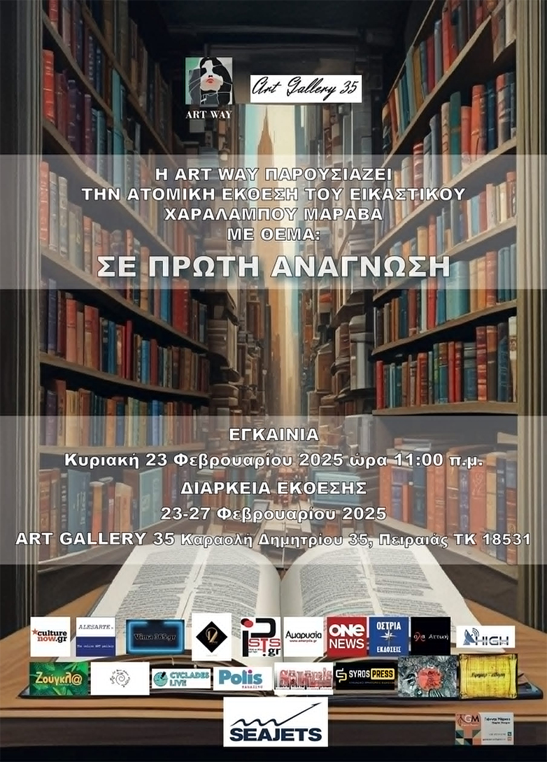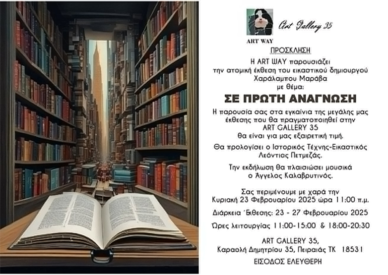 Η πρώτη ατομική έκθεση του Χαράλαμπου Μαράβα με θέμα «Σε πρώτη ανάγνωση» θα πραγματοποιηθεί την Κυριακή 23-2-2025 και ώρα 11:00 π.μ. στην ΑRT GALLERY 35 ( Καραολή Δημητρίου 35, Πειραιάς, TK 18531).