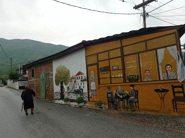 «Ζωγραφίσαμε 12 προσόψεις, αναδεικνύοντας την παλιά χρήση καταστημάτων αλλά και τη ζωή γενικότερα του χωριού, τις περασμένες δεκαετίες. Ο Πολιτιστικός Σύλλογος μας παρείχε κάποια χρώματα και μάστορες που μας βοήθησαν στις αναπαλαιώσεις των εξωτερικών όψεων των κτηρίων» αναφέρει η κ.Καραφλούδη. Έτσι, τα καταστήματα με εμπορικές χρήσεις του παρελθόντος που παραμένουν κλειστά εδώ και χρόνια, απέκτησαν «παράθυρα» όπου οι περαστικοί μπορούν να δουν τη ζωή που φιλοξένησαν και το χωριό να πάρει ακόμη μία προστιθέμενη, τουριστική αξία.