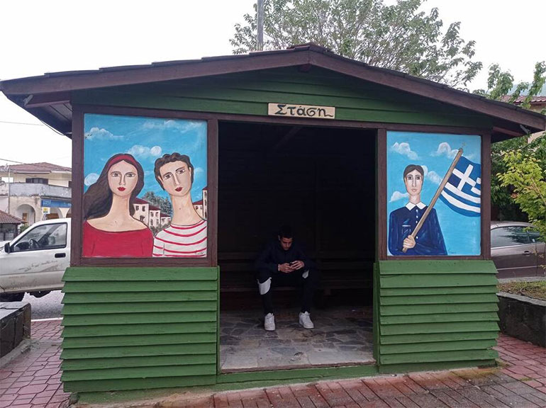 Στον χώρο όπου δηλαδή λειτουργούσε το κομμωτήριο, υπάρχει ζωγραφιά με γυναίκες της δεκαετίας ’60 να φτιάχνουν τα μαλλιά τους, το περίπτερο που έχασκε άδειο εδώ και περίπου 10 χρόνια «ξανανοίγει» και στο μπακάλικο «Η Αφθονία» ο καταστηματάρχης υποδέχεται τους πελάτης κρατώντας τη σέσουλα. Χρώμα με προσωπογραφίες παιδιών αποκτά και η στάση λεωφορείων ενώ όλο το χωριό αποτυπώνεται στη στάση των ταξί!