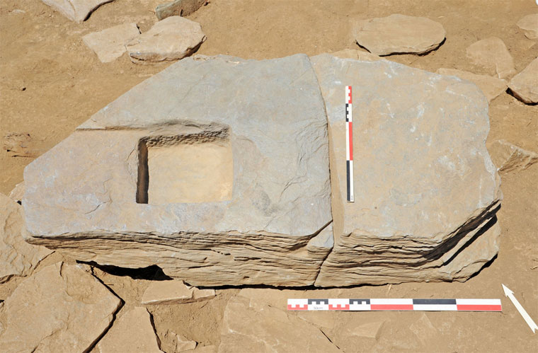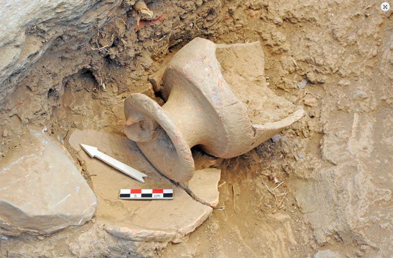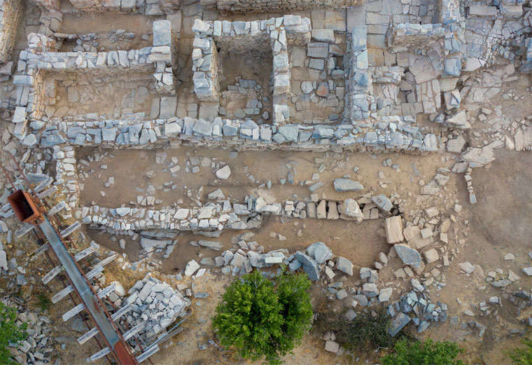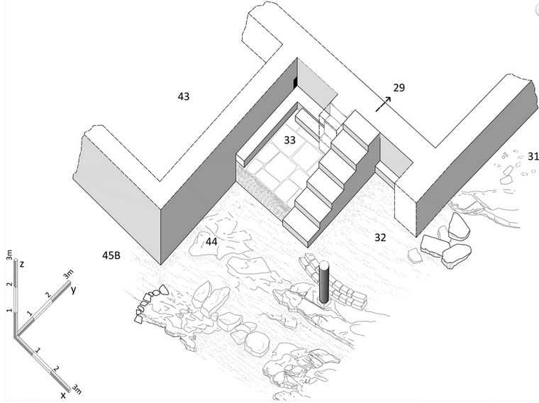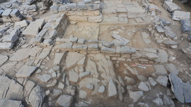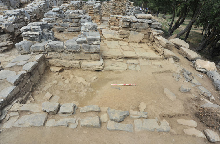 – Στη νοτιοανατολική μεγαλοπρεπή είσοδο οι τομές ανέδειξαν τις παραστάδες αλλά και αποκάλυψαν πλήρως τον δυτικό χώρο με βωμό και αποθέτη, καθώς και το δάπεδο ορόφου που διατηρήθηκε πεσμένο λοξά προς εξωτερικό χώρο.