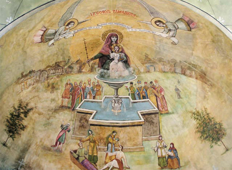 Γύρω από το σιντριβάνι εικονίζονται ο αυτοκράτορας και πολλοί ασθενείς με ποικίλες ασθένειες. Δέχονται το αγίασμα με το οποίο τους ραντίζουν οι υγιείς. Στην άκρη ζωγραφίζεται μια δεξαμενή με ψάρια, αφού όπως είπαμε Μπαλουκλί σημαίνει τόπος ψαριών.