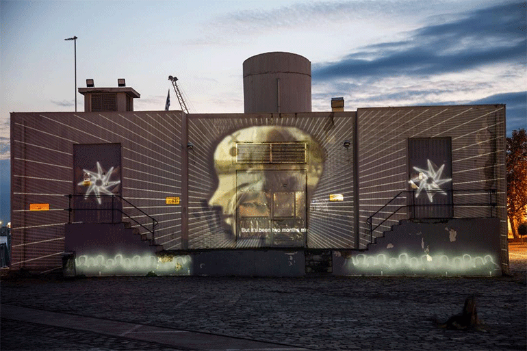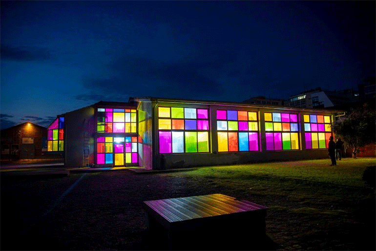 Στην προβλήτα 1 του Λιμανιού της Θεσσαλονίκης, ένα κτήριο με γυάλινη πρόσοψη μεταμορφώθηκε σε πηγή χρωμάτων και λάμψης για όσο διάστημα η κινηματογραφική γιορτή της πόλης φωτίζει την καθημερινότητα της εποχής της πανδημίας.