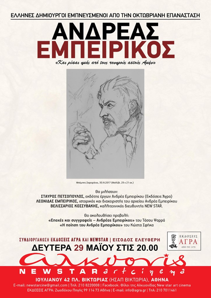 Οι εκδόσεις «Άγρα» και η New Star συνδιοργανώνουν την εκδήλωση «Ανδρέας Εμπειρίκος» αφιερωμένη στον Ανδρέα Εμπειρίκο,τη Δευτέρα 29 Μαΐου στις 20.00 στο Αλκυονίς new star art cinema.