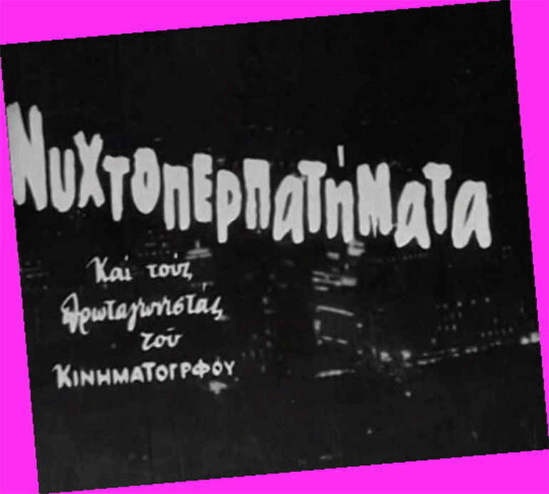 Απόψε το βράδυ η ταινιοθήκη του zougla.gr προβάλλει online την ταινία «Νυχτοπερπατήματα». Πρόκειται για ένα ντοκιμαντέρ του 1964 σε σκηνοθεσία Γιώργου Ζερβουλάκου με θέμα τη νυχτερινή ζωή στην Αθήνα. Τα νυχτερινά κέντρα, τα μουσικά νούμερα, τα σόου στριπτίζ, αλλά και κάποια δραματοποιημένα νούμερα με γνωστούς ηθοποιούς…