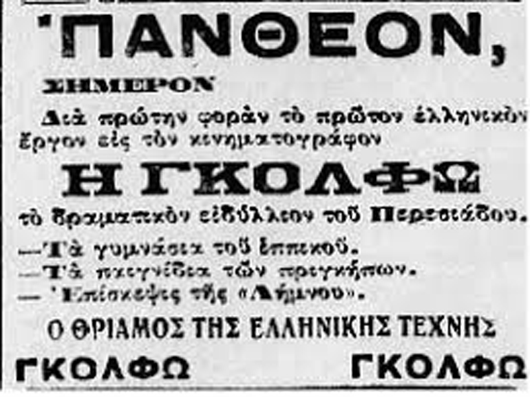 Σαν σήμερα έγινε η πρώτη μεταφορά στη μεγάλη οθόνη του βουκολικού δράματος του Σπυρίδωνος Περεσιάδη «Γκόλφω», που αποτελεί και την πρώτη ταινία μεγάλου μήκους στην ιστορία του ελληνικού κινηματογράφου. Είναι, επίσης, η πρώτη ταινία «φουστανέλας», ενός αποκλειστικά ελληνικού κινηματογραφικού είδους, που άκμασε τις δεκαετίες του ’50 και του ’60.