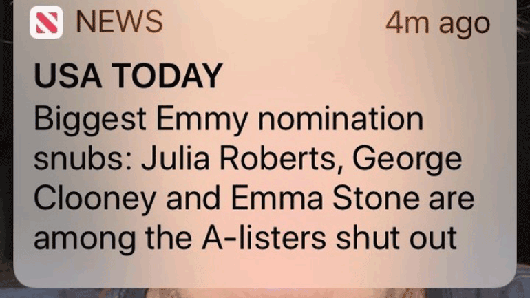 «Λοιπόν, τουλάχιστον συνεργάζομαι με μία εξαιρετική εταιρεία», έγραψε η Ρόμπερτς στον λογαριασμό που διατηρεί στο Instagram μαζί με ένα στιγμιότυπο από την οθόνη του κινητού της όπου φαίνεται ένα μήνυμα με τα ονόματα ηθοποιών πρώτης γραμμής που έμειναν εκτός βραβείων, όπως ο Τζορτζ Κλούνεϊ που πρωταγωνιστεί στο Catch 22 και την Έμα Στόουν πρωταγωνίστρια του Maniac.
