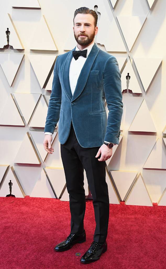 Ο Κρις Έβανς φόρεσε σακάκι σε χρώμα και υφή που δεν πέρασαν απαρατήρητα. Το aqua μπλε βελούδο σακάκι με μαύρο παντελόνι Salvatore Ferragamo ήταν μια σπουδαία εμφάνιση, που τον ενέταξε στη λίστα των πιο καλοντυμένων ανδρών στο κόκκινο χαλί των Όσκαρ.