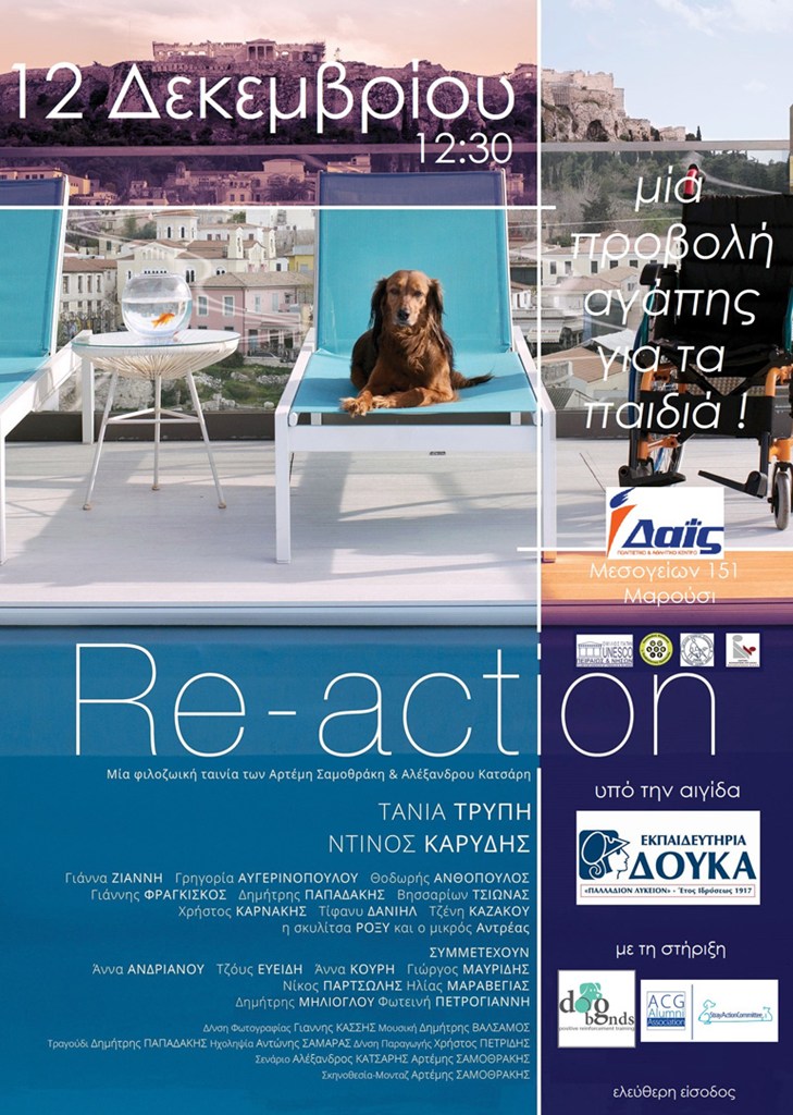 Στο πλαίσιο του προγράμματος ευαισθητοποίησης «Στάση Ζωής» που εφαρμόζουν τα Εκπαιδευτήρια Δούκα σε θέματα κοινωνικής προσφοράς, θα προβληθεί η ελληνική φιλοζωική, μη εμπορική ταινία μεγάλου μήκους «Re-Action», την Τρίτη 12 Δεκεμβρίου και ώρα 12.30, στο Θέατρο του Αθλητικού και Πολιτιστικού Κέντρου Δαΐς.