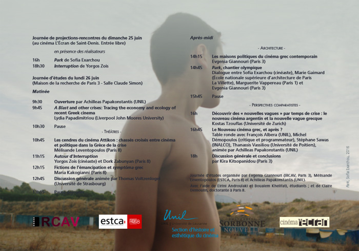 Το πρόγραμμα της ημερίδας με θέμα τις πιθανές πολιτικές διαστάσεις του σύγχρονου Ελληνικού κινηματογράφου μυθοπλασίας,θα πραγματοποιηθεί τη Δευτέρα 26 Ιουνίου στο Maison de la reche rche του Πανεπιστημίου Paris 3 (αίθουσα Claude Simon).