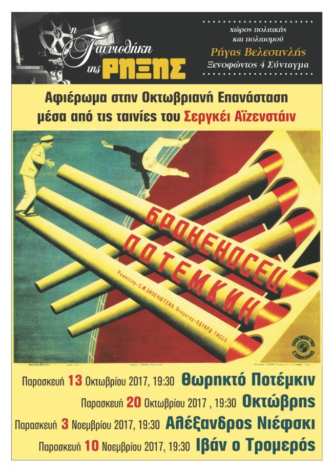 Η ταινιοθήκη της Ρήξης θα πραγματοποιήσει τον Οκτώβριο και τον Νοέμβριο ένα κινηματογραφικό αφιέρωμα για το πώς αποτυπώθηκε η Οκτωβριανή Επανάσταση και η εξέλιξή της στο σινεμά μέσα από τις ταινίες του Σεργκέι Αϊζενστάιν.