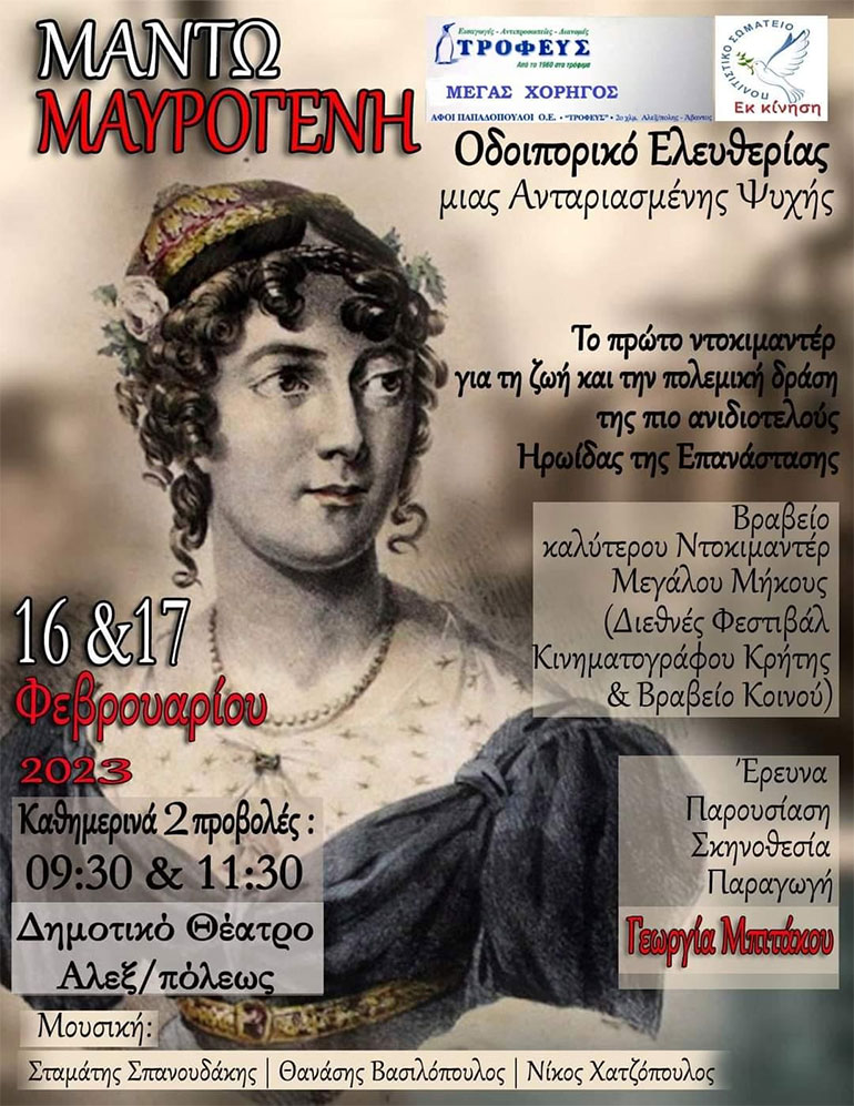 Με απόλυτη επιτυχία στέφθηκαν οι προβολές του ιστορικού ντοκιμαντέρ «Μαντώ Μαυρογένη. Οδοιπορικό μιας ανταριασμένης ψυχής» το οποίο προβλήθηκε στους μαθητές, αλλά και στο κοινό της Αλεξανδρούπολης, το διήμερο 16 και 17 Φεβρουαρίου 2023, στο Δημοτικό Θέατρο της πόλης μας. Ένα ντοκιμαντέρ το οποίο ανέδειξε μια τεράστια μορφή της Ελληνικής Επαναστάσεως του 1821, της Μαντούς Μαυρογένους, μιας γυναίκας – σύμβολο η οποία «ρίχτηκε με όλο της το «είναι» στον Αγώνα για την Ελευθερία της Πατρίδος και πολέμησε μέχρι τέλους με ήθος και ανιδιοτέλεια. Μια γυναίκα – πρότυπο άξια μιμήσεως!