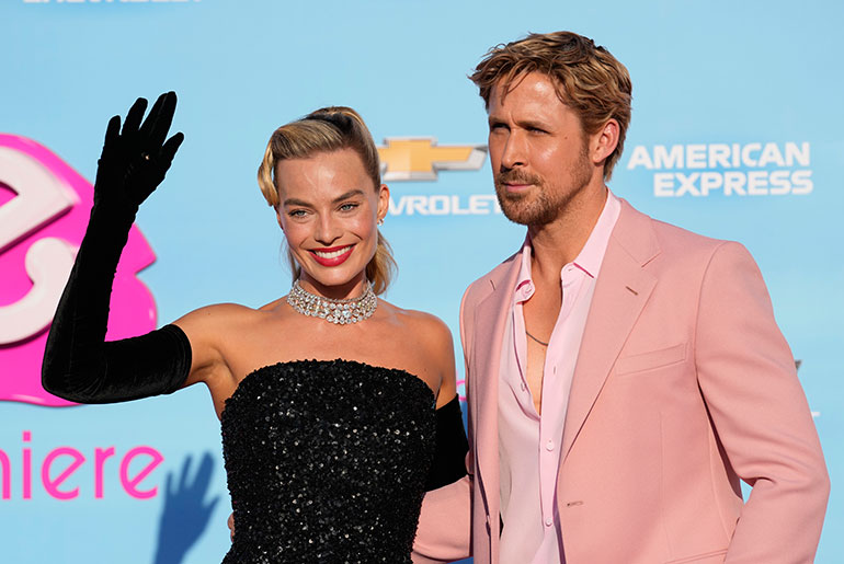 Στο πλάι της, ο συμπρωταγωνιστής της και δύο φορές υποψήφιος για Όσκαρ Ράιαν Γκόσλινγκ, ο οποίος επέλεξε ένα κοστούμι σε ροζ χρώμα από τον διάσημο οίκο Gucci. Το παρών έδωσαν μεταξύ άλλων η σκηνοθέτις της ταινίας Γκρέτα Γκέργουιγκ, ντυμένη και εκείνη στα ροζ, μαζί με τους Ντούα Λίπα, Νίκι Μινάζ και Αμέρικα Φερέρα.