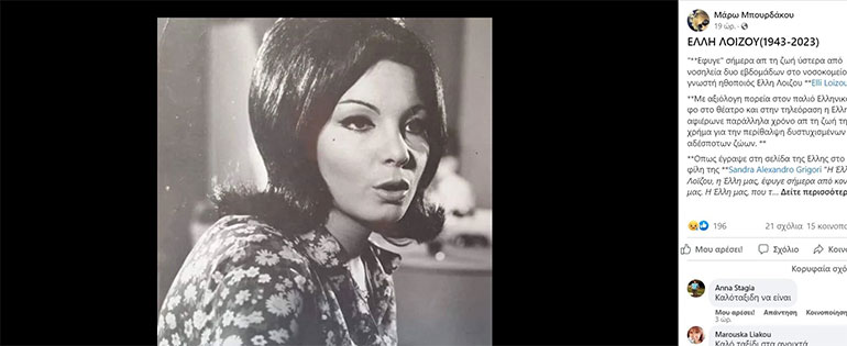 «Με αξιόλογη πορεία στον παλιό Ελληνικό κινηματογράφο, στο θέατρο και στην τηλεόραση η Έλλη Λοΐζου αφιέρωνε παράλληλα χρόνο απ’ τη ζωή της και χρήμα για την περίθαλψη δυστυχισμένων αδέσποτων ζώων» αναφέρει η ανάρτηση.