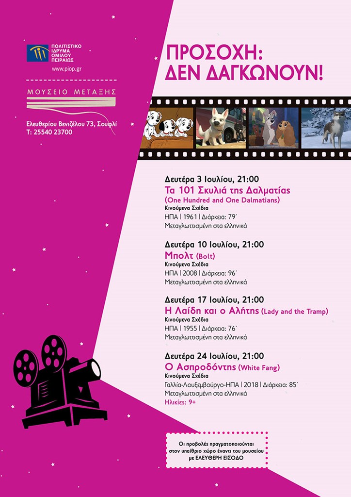 Προβολή ταινιών κινουμένων σχεδίων με πρωταγωνιστές τον καλύτερο φίλο του ανθρώπου τα σκυλάκια, οργανώνει κάθε Δευτέρα στις 21.00 από τις 3 έως τις 24 Ιουλίου το Πολιτιστικό Ίδρυμα Ομίλου Πειραιώς (ΠΙΟΠ) στο Μουσείο Μετάξης στο Σουφλί. Σύμφωνα με το πρόγραμμα του θερινού κινηματογραφικού αφιερώματος με τίτλο «Προσοχή: δεν δαγκώνουν!», θα προβληθούν οι εξής κλασικές και νεότερες ταινίες κινουμένων σχεδίων: