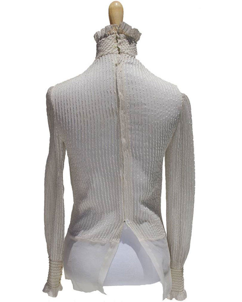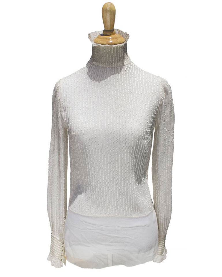 Η ιβουάρ χρώματος μπλούζα από μετάξι με ρίγες στην ύφανση, έχει ψηλό λαιμό με βολάν, λεπτομέρειες στις μανσέτες και καλυμμένα με ύφασμα κουμπιά.