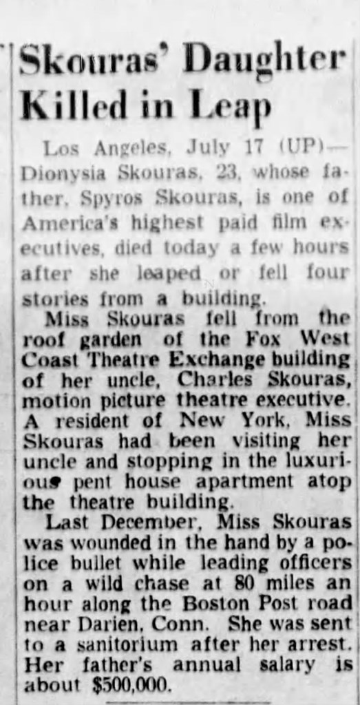 Στην πραγματικότητα, αυτό το deal είναι μία ακόμη θαυμαστή εμπορική ντρίπλα του τετραπέρατου Έλληνα. Η Fox, κολοσσός στον χώρο του σινεμά, είναι στα πρόθυρα της χρεωκοπίας. Έχει δάνεια στην Chase National Bank, που δεν μπορεί να εξυπηρετήσει. Από την άλλη, η 20th Century είναι μια μικρή, σχεδόν ασήμαντη κινηματογραφική εταιρεία, χωρίς δάνεια και οφειλές. Ο Σπύρος ρίχνει στα αδέλφια του την ιδέα να αγοράσουν την 20th κι εκείνα δέχονται αμέσως. Ύστερα, πηγαίνει στην τράπεζα και προτείνει τη συγχώνευση των δύο εταιρειών, προκειμένου να μην πτωχεύσει η Fox και χαθεί η οφειλή της. Ο τραπεζίτης κάνει τη δουλειά του και οι Σκουραίοι τη δική τους. Η τράπεζα πείθει τη Fox για τη συγχώνευση και ο Σπύρος βρίσκεται μεγαλομέτοχος στην εταιρεία κολοσσό. Η συμφωνία τον οδηγεί στην κορυφαία καρέκλα του νεότευκτου οργανισμού υπό τον τίτλο «20th Century Fox». Μια νέα ανοδική πορεία ξημερώνει για το «μπροστοκρίαρο» από το Σκουροχώρι. Καλός ο Κάρολος, εργατικός και ο Γιώργης. Ο Σπύρος όμως είναι δαίμονας. Έχει ιδέες και δεν διστάζει να ρισκάρει για να τις εφαρμόσει. Έτσι κι αλλιώς, είναι τόσο επισφαλής η εποχή, που το βυθισμένο σινεμά μόνο να κερδίσει έχει από τα άλματα. Από κοντά στη φιλόδοξη διαδρομή του και η σύζυγός του Σαρούλα, αλλά και τα τέσσερα παιδιά με τα διπλά ονόματα, που στο μεταξύ έχουν αποκτήσει. Ο Σπύρος Σολών (1923), η Ντιάνα Αθανασία (1925), η Διονυσία Κολίν (1926) και ο Πλάτων Αλέξανδρος (1930). Ένα άτυχο βρέφος, η Δάφνη Ντολόρες, που έχει γεννηθεί το 1924 κι έχει πεθάνει πριν καλά καλά ζήσει, είναι το πρώτο καρφί της οικογένειας. Το επόμενο, μεγαλύτερο καρφί, θα έρθει το 1950, όταν στα μόλις 24 της θα χάσει τη ζωή της σε ατύχημα -ο Τύπος κάνει σαφώς λόγο για αυτοκτονία- η Διονυσία Κολίν. Στις εφημερίδες, τις φωτογραφίες με το ματωμένο κορμί της νεαρής στο πεζοδρόμιο συνοδεύουν μονόστηλα, που επικεντρώνουν στην αίγλη του πατέρα της… «Η κόρη του Σκούρα αυτοκτονεί βουτώντας στο κενό» είναι ο τίτλος στο δημοσίευμα της “Courier Post” εκείνη τη Δευτέρα στις 17 Ιουλίου του 1950. «Η Διονυσία Σκούρα, 23 χρόνων, της οποίας ο πατέρας Σπύρος Σκούρας είναι από τους υψηλότερα αμειβόμενους παραγωγούς του κινηματογράφου, εξέπνευσε λίγες ώρες μετά το άλμα, ή την πτώση, της από τον τέταρτο όροφο ενός κτηρίου. Η δις Σκούρα έπεσε από τον τελευταίο όροφο του κτηρίου Fox West Coast Theater του θείου της Κάρολου Σκούρα, στελέχους της βιομηχανίας του κινηματοθέατρου. Κάτοικος της Νέας Υόρκης, η δις Σκούρα επισκέφθηκε τον θείο της στο πολυτελές ρετιρέ του κτηρίου, όπου στεγάζεται το θέατρο. Τον περασμένο Δεκέμβριο, η δις Σκούρα είχε τραυματιστεί στο χέρι από σφαίρα αστυνομικού κατά τη διάρκεια ενός άγριου κυνηγητού από αυτοκίνητο της αστυνομίας, στον δρόμο Boston Post, όπου εκείνη οδηγούσε με 80 μίλια την ώρα. Μετά τη σύλληψή της δέχθηκε τις πρώτες βοήθειες. Η ετήσια αμοιβή του πατέρα της φτάνει τα 500.000 δολάρια (!)».