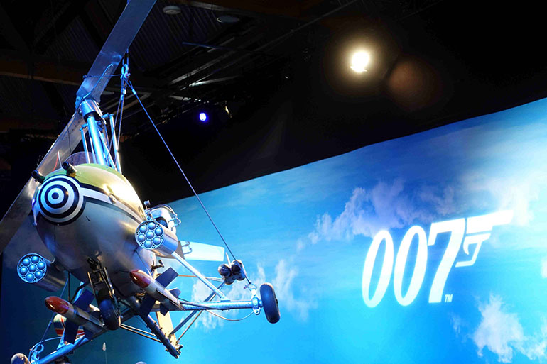 Με τα τραγούδια από τα επίσημα σάουντρακ να ακούγονται από τα μεγάφωνα, ο επισκέπτης, με το που εισέρχεται στον χώρο βρίσκεται μπροστά σε μια πλούσια με αντικείμενα από τις ταινίες αίθουσα, ενώ κάποια στιγμή αντιλαμβάνεται πως από πάνω του κρέμεται το αυθεντικό ελικοπτεράκι από το «You Only Live Twice», η «Little Nellie», που έστειλε ο Q σε τέσσερις βαλίτσες στον 007. Τεχνολογικό επίτευγμα της εποχής, η «Little Nellie», ένα τροποποιημένο Wallis WA-116 Agile βρετανικό αυτόγυρο αεροπλάνοελικόπτερο των 1960s, που ανέπτυξε για την ταινία Βρετανός, κρέμεται από ψηλά, ενώ δίπλα της, οι δημιουργοί της «Bond In Motion» χαρίζουν στον τυχερό επισκέπτη την ευκαιρία να δει το κανονικό αεροπλάνο-υποβρύχιο της τελευταίας ταινίας του 007, του «No Time to Die» (2021).